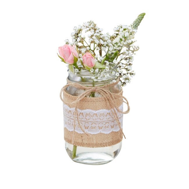 Dekoriere deine Hochzeit mit den wunderschönen Vintage Vasen und den dazu passenden Frühlingsblumen. Die Vasen sind ummantelt mit Jute und Spitze und sorgen für einen romantischen Flair auf der Tischdeko. Die Vasen passen zu jeder Vintage Hochzeit und sind auch als Gastgeschenk ein ideales Give-Away.