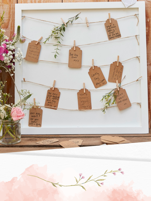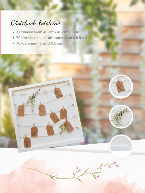Ein besonderes Gästebuch zur Hochzeit ist dieser Rahmen mit Leine und Karten zum Beschriften und Aufhängen. Die Leine muss noch im Rahmen festgebunden werden, wird aber bereits in der richtigen Länge geliefert. Das Gästebuch ist wirklich etwas besonderes und ist ein Eyecatcher auf deiner Hochzeit im Vintage Stil. Auf den Karten können die Gäste ihre Glückwünsche und Sprüche schreiben und mit einer Klammer auf der Leine befestigen. Besonders hübsch ist es auch, wenn die Gäste Bilder und Schnappschüsse von der Hochzeit an der Leine befestigen. Nach der Hochzeit kann der Rahmen zu Hause aufgehängt werden und erinnert im an den BEST DAY EVER.