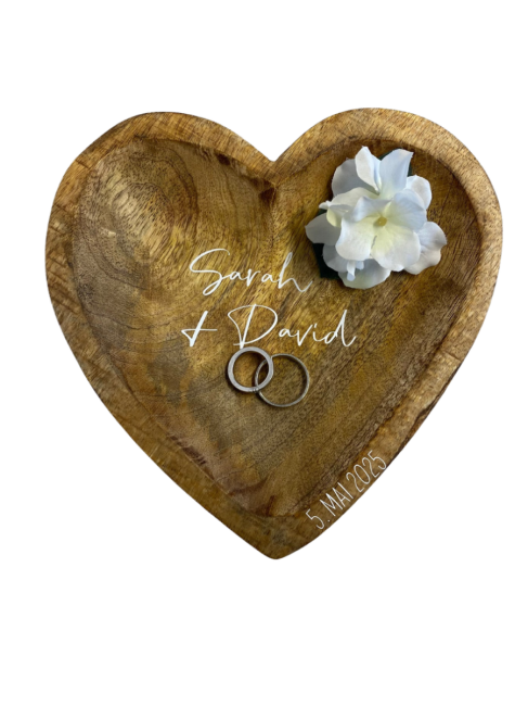 Entdecke unsere wunderschöne personalisierbare Ringschale aus Mangoholz, ideal für die kirchliche oder standesamtliche Trauung. Diese herzförmige Schale wird in der Mitte mit dem Namen des Brautpaares und am Rand mit dem Hochzeitsdatum dekoriert. Um die Personalisierung vorzunehmen, bitten wir dich, uns die Daten per E-Mail zukommen zu lassen. Die Ringschale besteht aus hochwertigem Mangoholz, das für seine natürliche Schönheit und Haltbarkeit bekannt ist. Jede Schale ist ein Unikat, da das verwendete Mangoholz ein Naturprodukt ist. Bitte beachte, dass abweichende Maserungen und Asteinschlüsse Teil des natürlichen Charmes sind und keinen Reklamationsgrund darstellen.