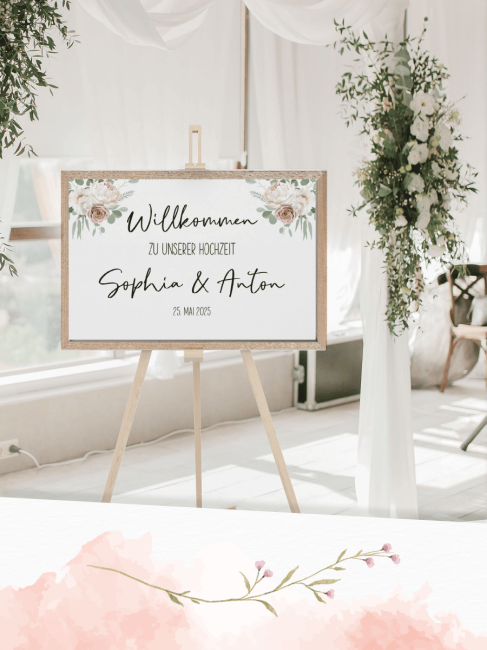 Mache deine Hochzeit zu einem unvergesslichen Erlebnis mit unserem personalisierten Willkommensposter Hochzeit mit floralen Elementen. Begrüße deine Gäste stilvoll und setze ein Zeichen der Liebe und Individualität.
